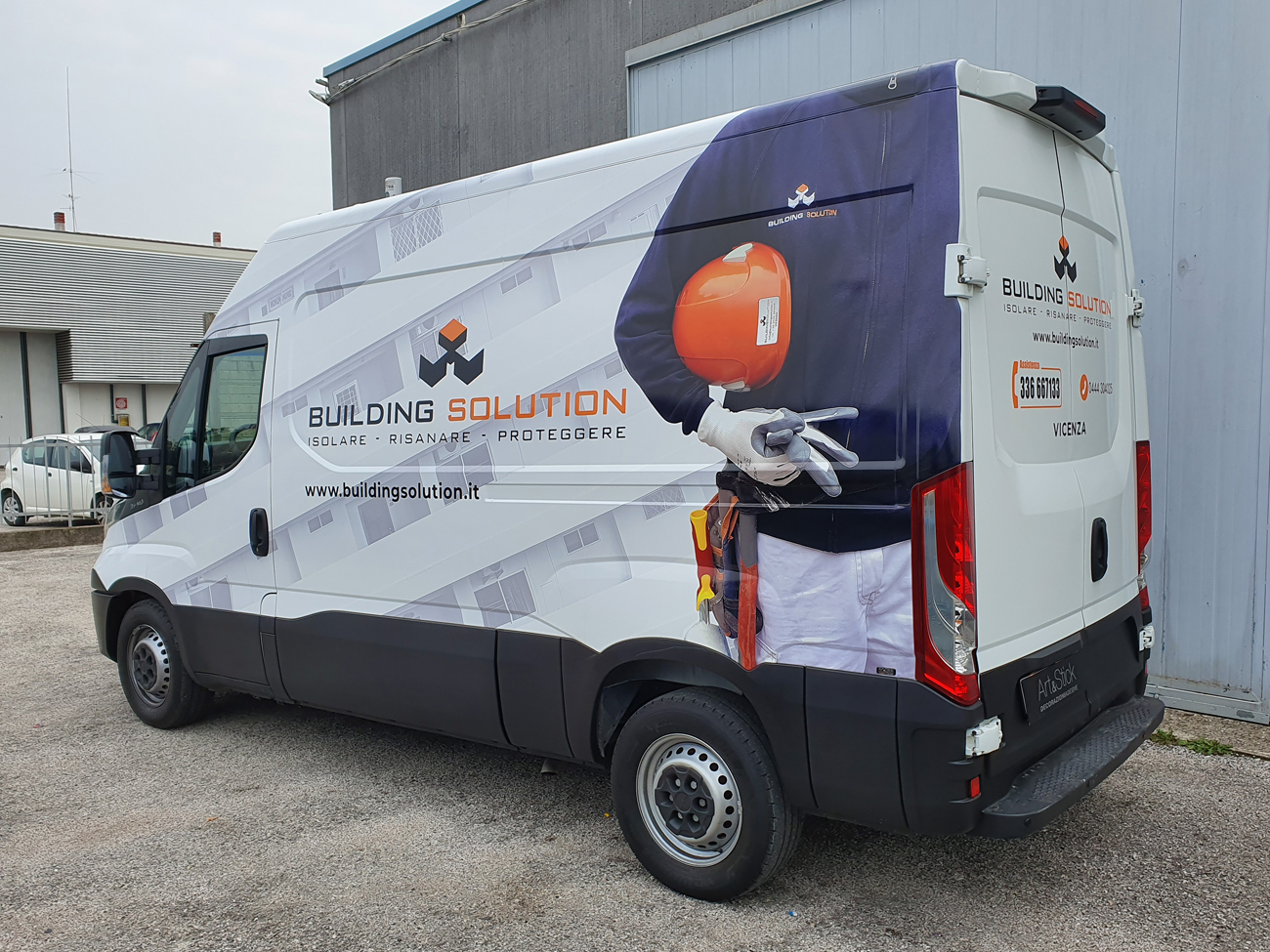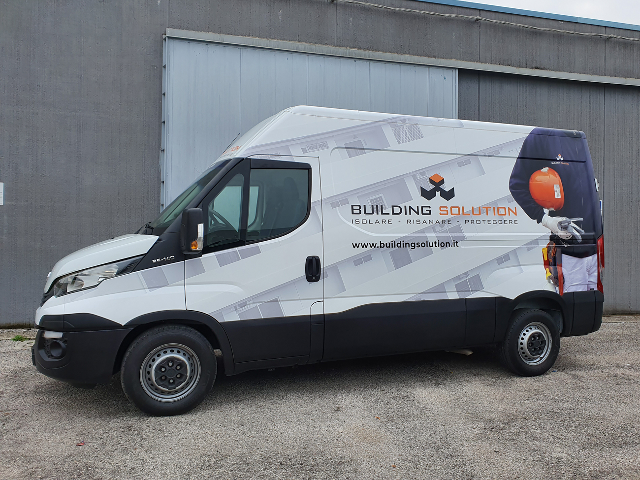 Rivestimento completo lati automezzo con pellicola cast da car wrapping stampata e laminata e applicazione di adesivi prespaziati di vari colori