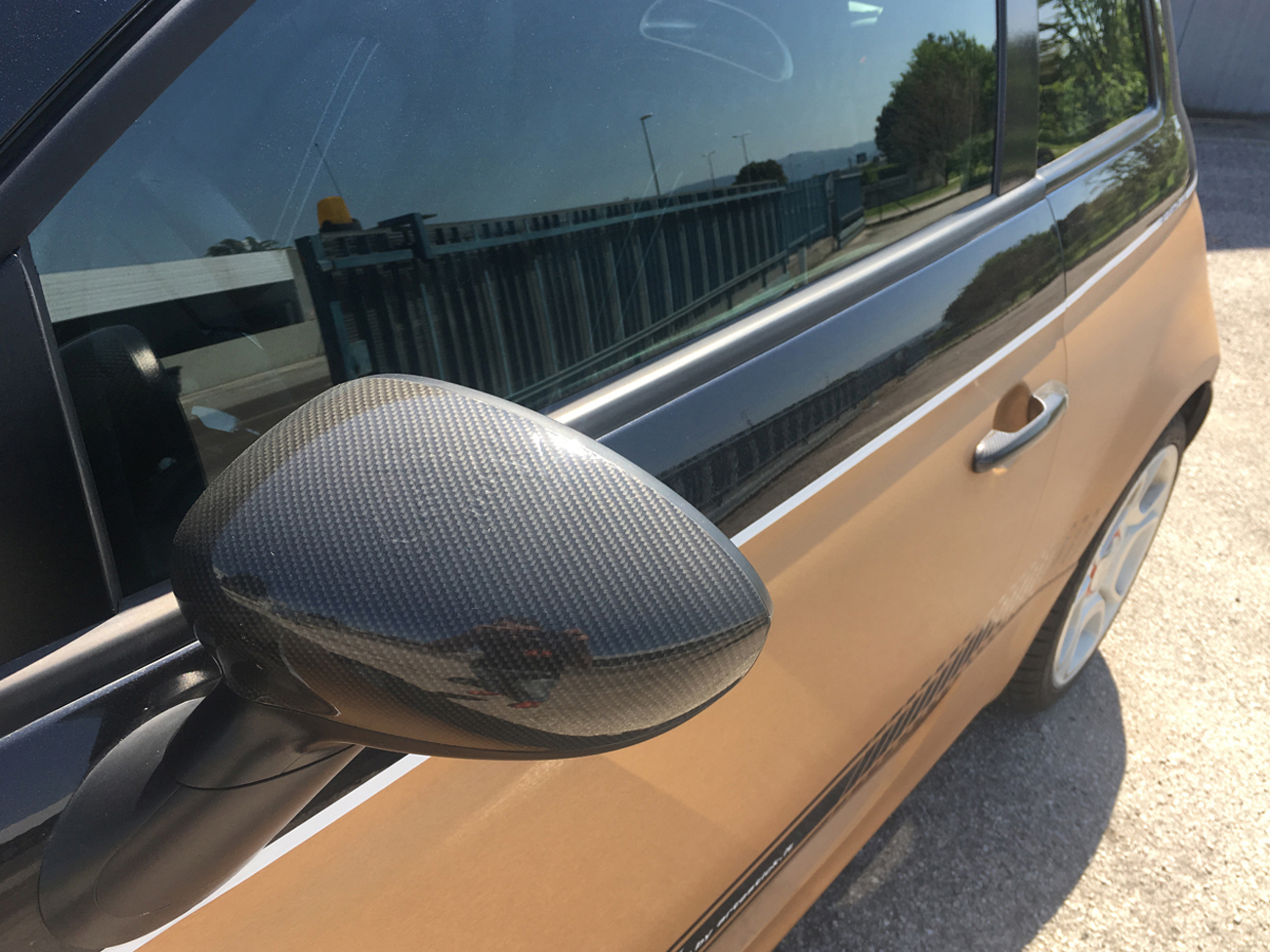 Inoltre sono rivestite le cromature e gli specchietti con adesivo “effetto carbonio lucido” e fasce laterali “Abarth” personalizzate.