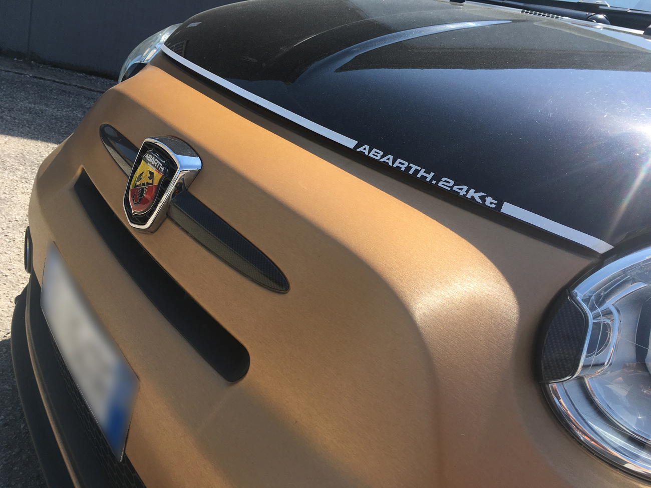 Rivestimento parziale Abarth 500 con pellicola cast da car wrapping “Avery oro spazzolato”.