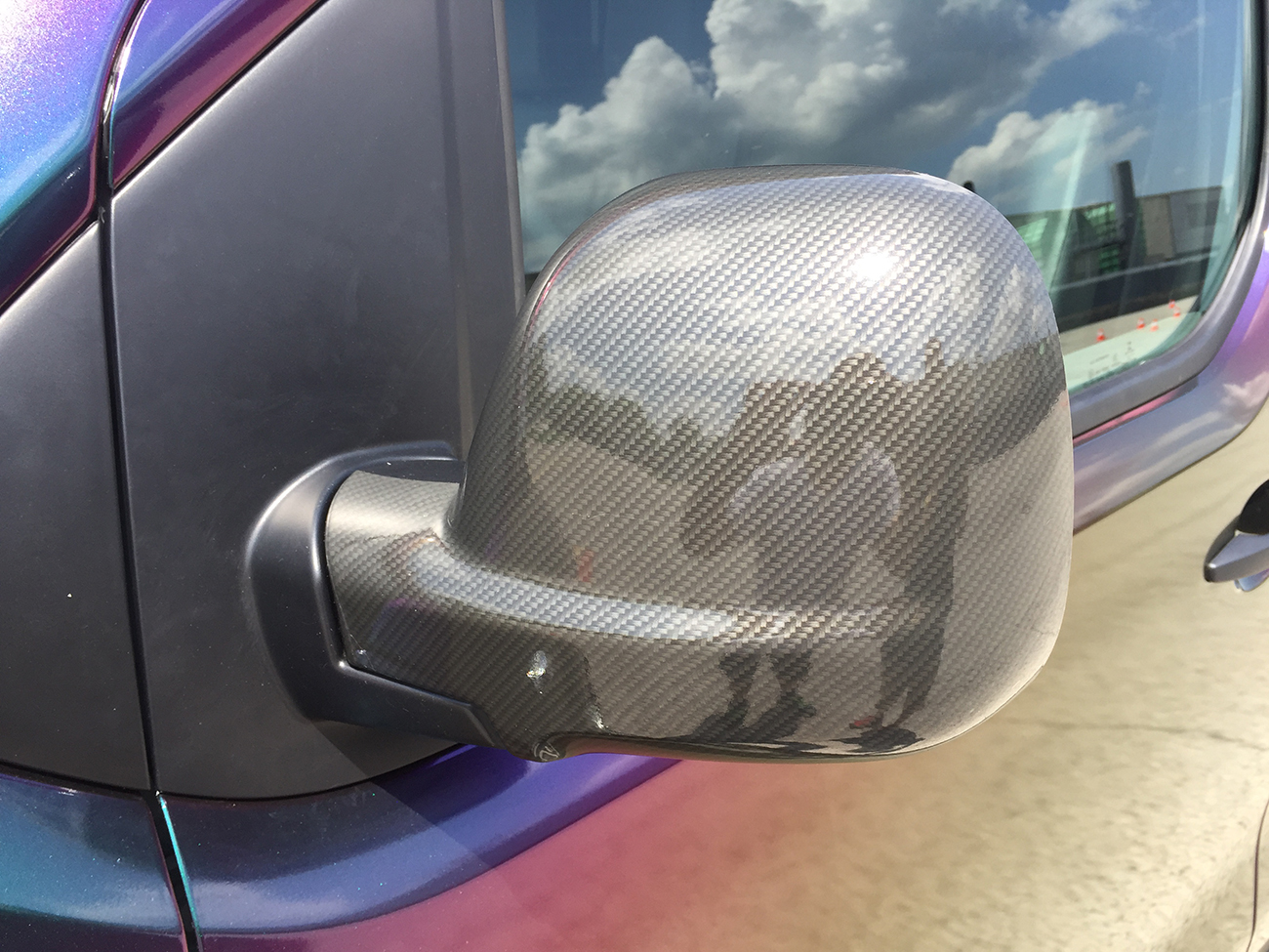 Specchietti retrovisori rivestiti con pellicola “effetto carbonio lucido” e scritte pubblicitari in adesivo prespaziato.