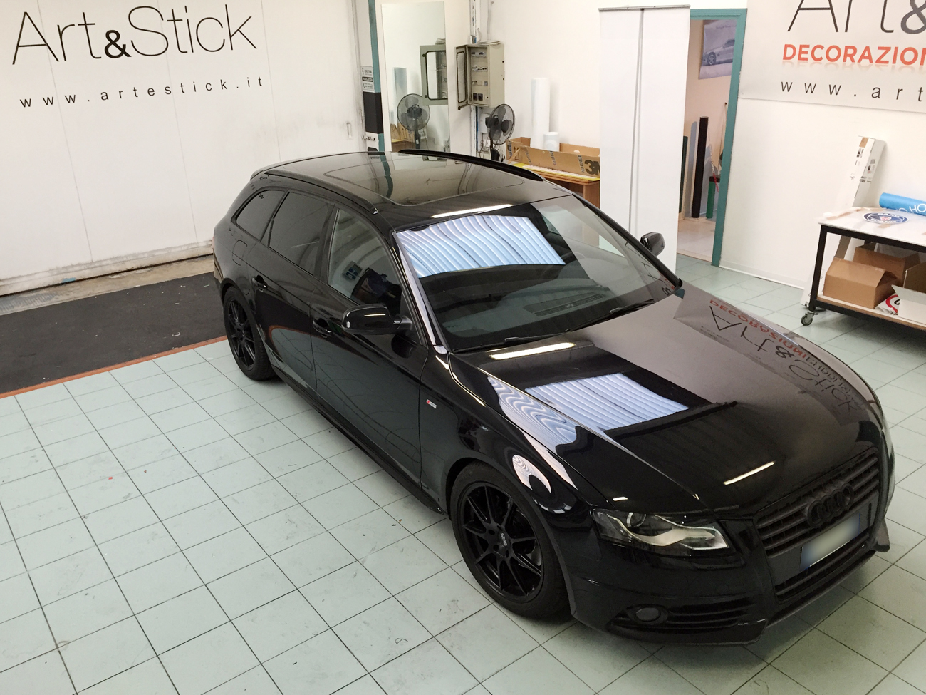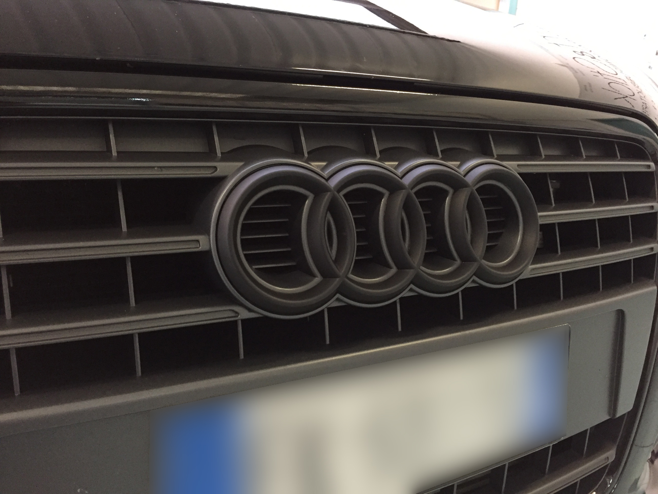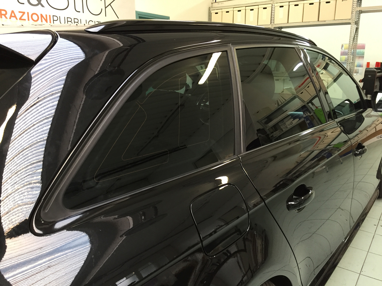 Copertura cromature Audi A4 avant su griglia frontale, contorno fendinebbia, contorno vetri laterali, barre tetto. Loghi e scritte ricoperte con Plastidip nero opaco 1