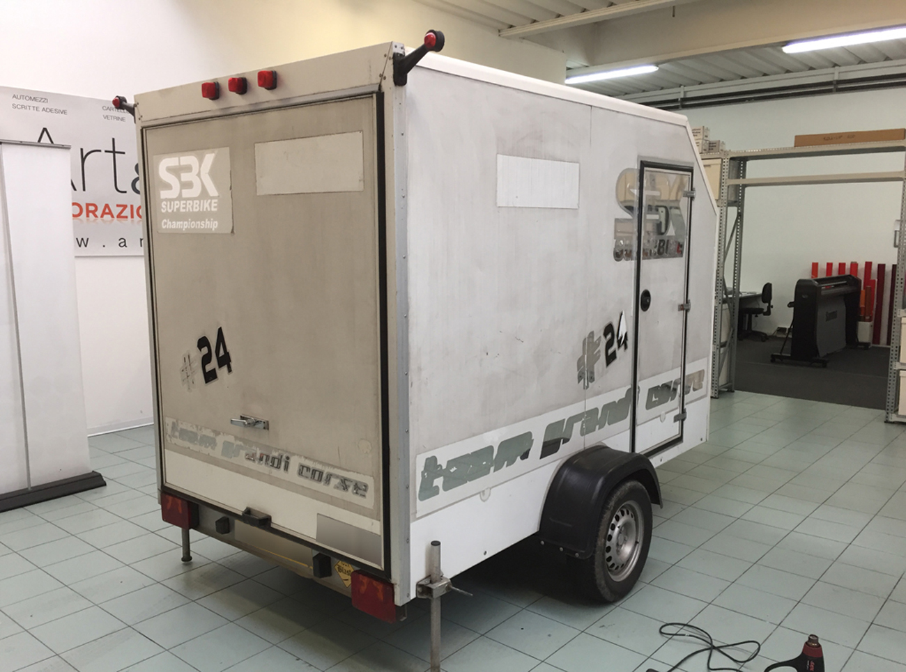Lavorazione: decorazione carrello con adesivi stampati in digitale e profili decorati in nero opaco cast.