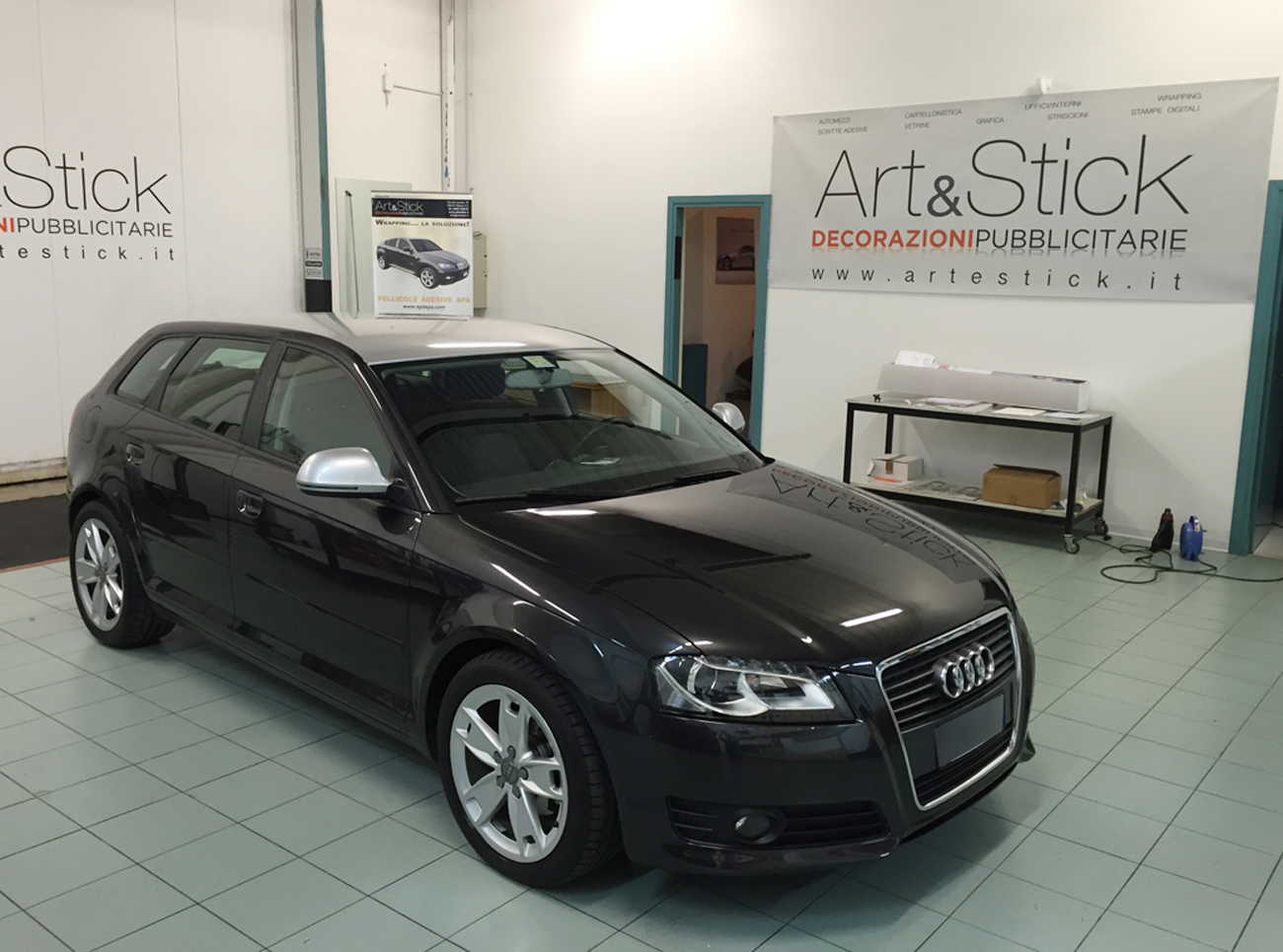 Personalizzazione Audi A3 rivestendo tetto e specchietti retrovisori con pellicola adesiva da car wrapping colore argento lucido.