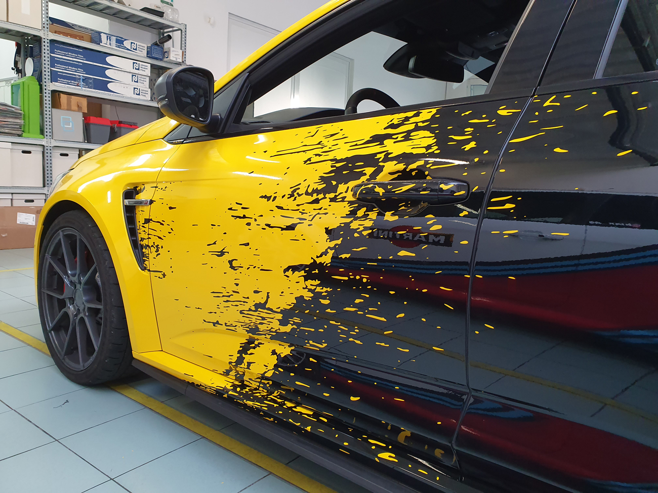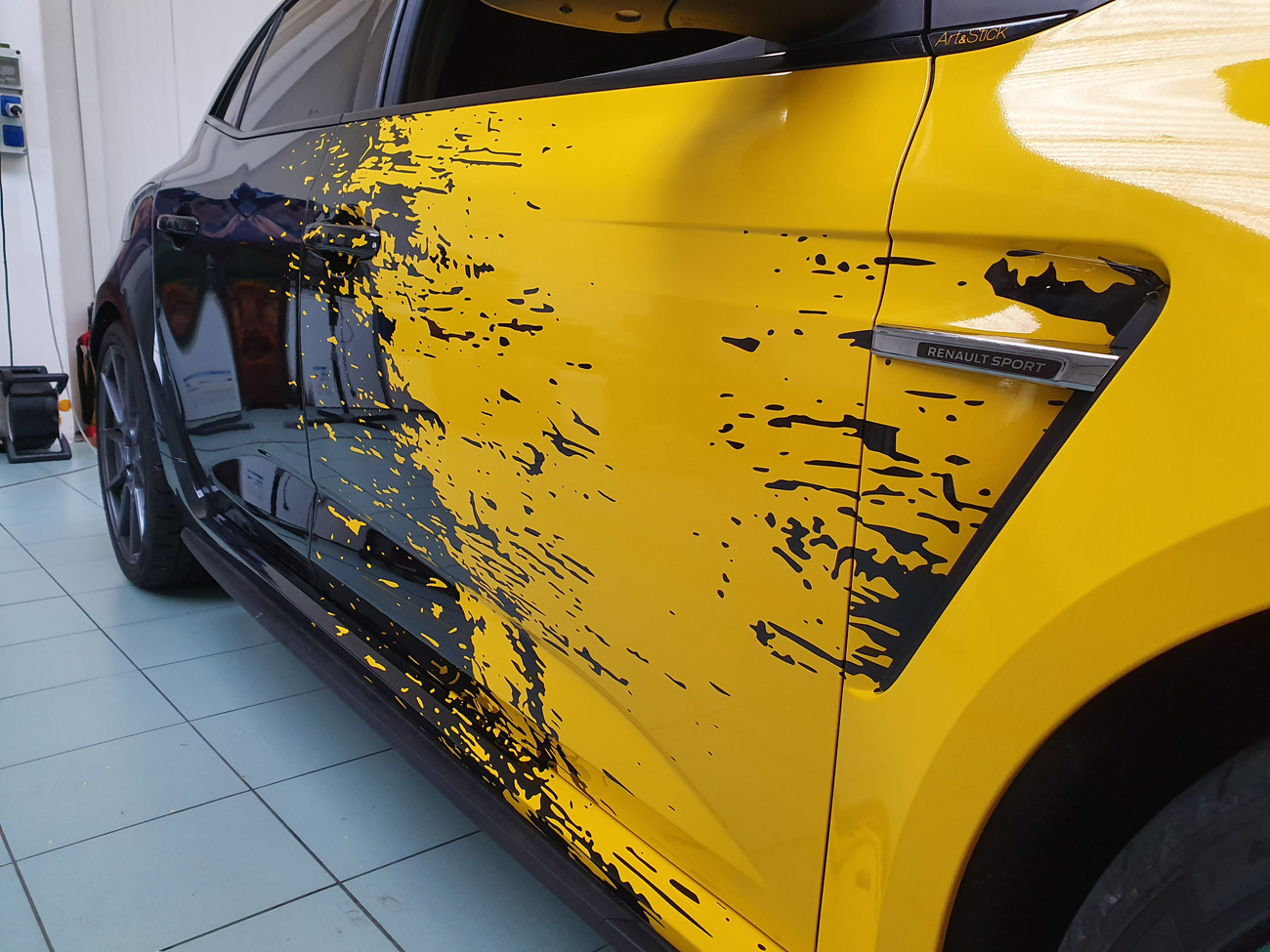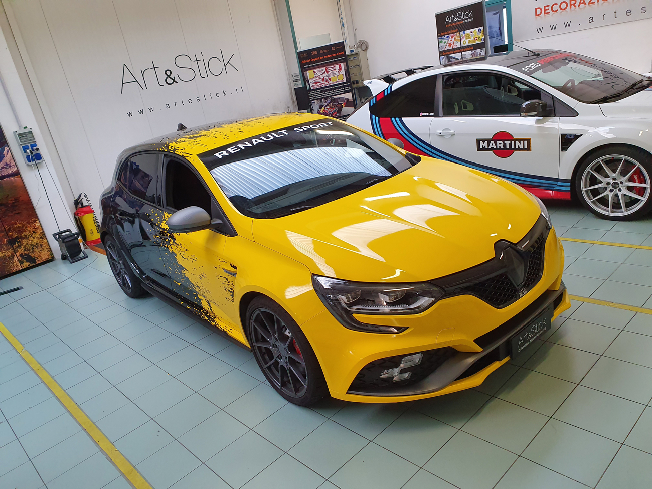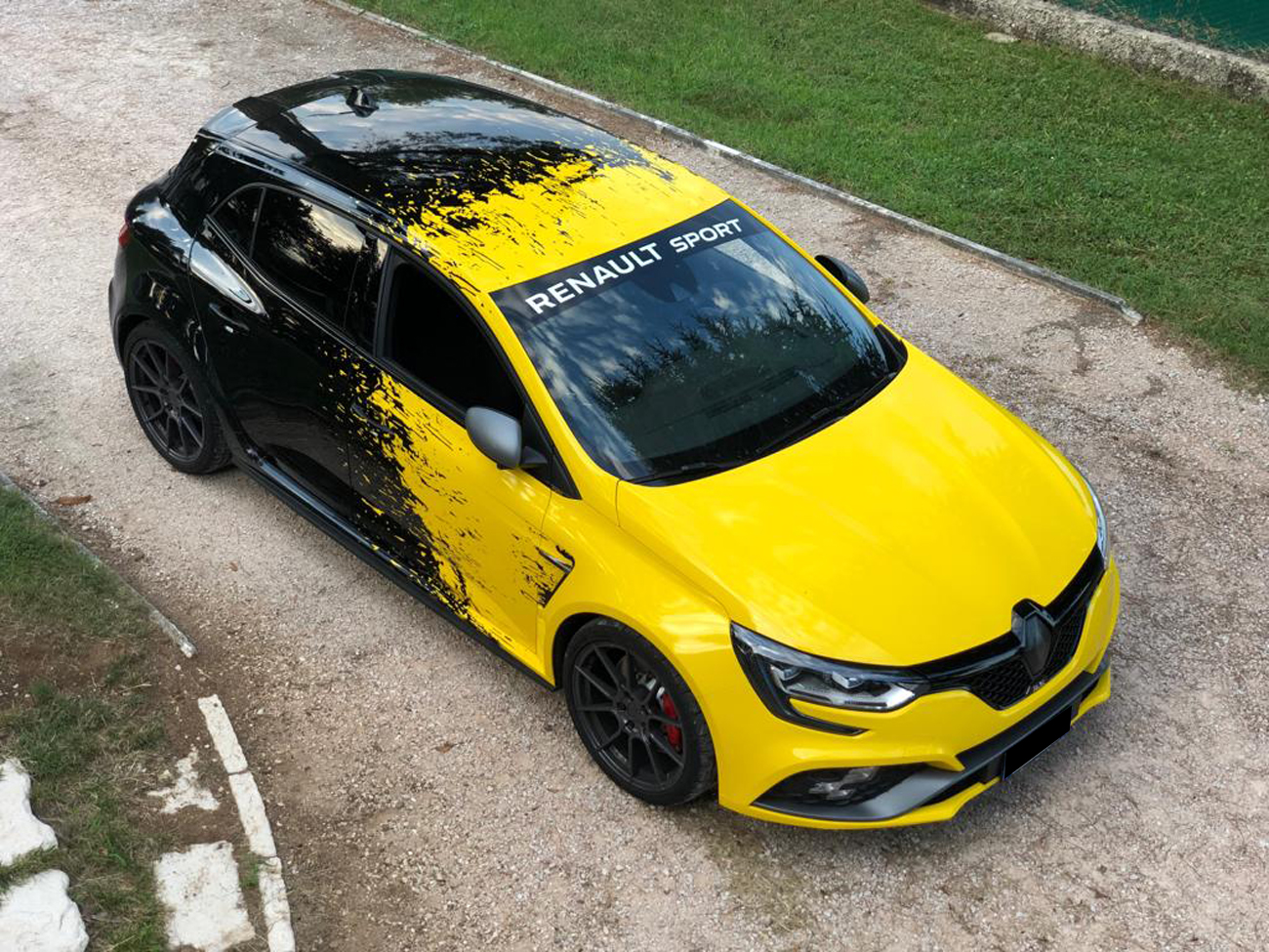 Personalizzazione grafica e rivestimento Renault Megane RS con pellicola adesiva Avery giallo lucido e grigio metallizzato da car wrapping.
